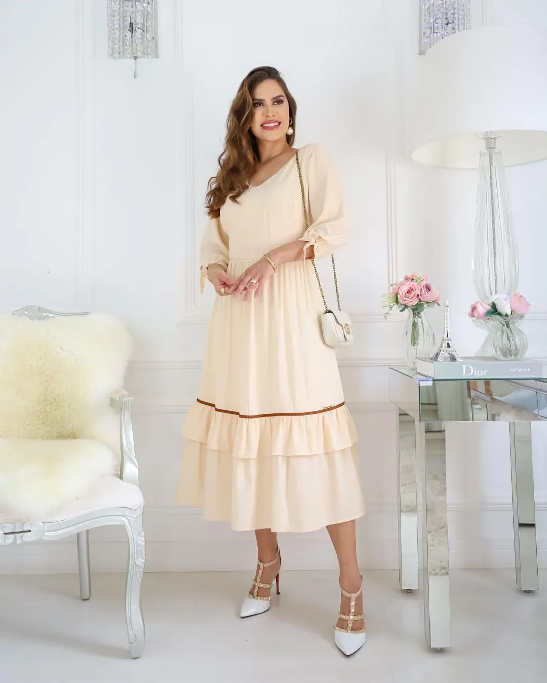 O nosso modelo charmosa e um vestido fabricado no viscolinho , modelo super sofisticado e muito elegante, com muitos detalhes compondo esse look incrível, blusa com recorte de peito no busto dando aquele charme super delicada essa peça , manga com Franzido na altura do ombro e punho com tiras pra fazer laço, e a nossa saia queridinha com Maria composta Franzida, e um detalhe de cor por cima da Maria